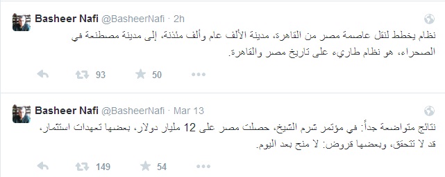 قال بشير نافع -أستاذ سابق للتاريخ والدراسات الإسلامية في كلية بيركبيك جامعة لندن- إن نظام يخطط لنقل عاصمة مصر من القاهرة، مدينة الألف عام وألف مئذنة، إلى مدينة مصطنعة في الصحراء، هو نظام طارئ على تاريخ مصر والقاهرة.