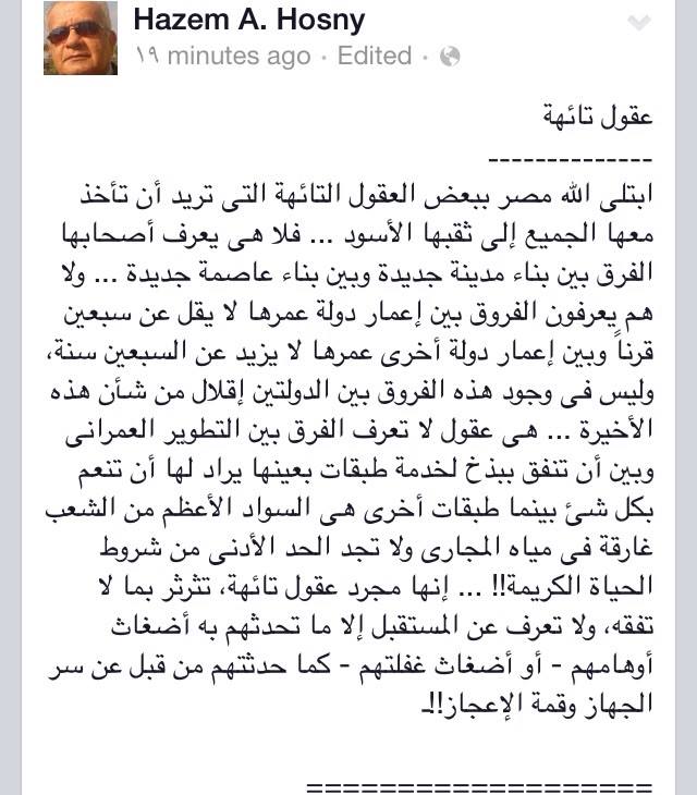 واستنكر حسني عبر الفيس بوك مشروع إنشاء العاصمة الجديدة قائلا: ابتلينا بعقول لا تعرف الفرق بين التطوير العمراني وبين أن تنفق ببذخ لخدمة طبقات بعينها يراد لها أن تنعم بكل شئ بينما طبقات أخرى هي السواد الأعظم من الشعب غارقة في مياه المجاري ولا تجد الحد الأدنى من شروط الحياة الكريمة!!".