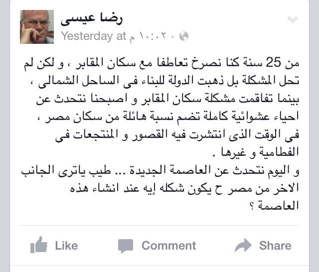 بدوره استنكر الكاتب الصحفي رضا عيسي اتجاه الدولة لمثل هذه المشروعات في وقت لم تنتهِ من مشاكل قديمة، وقال على صفحته الشخصية في موقع التواصل الاجتماعي الفيس بوك: "من 25 سنة كنا نصرخ تعاطفًا مع سكان المقابر، ولكن لم تحل المشكلة بل ذهبت الدولة للبناء في الساحل الشمالي، بينما تفاقمت مشكلة سكان المقابر".
