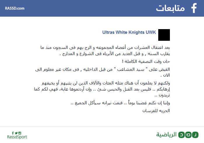 أعلن أولتراس الزمالك، وايت نايتس، عبر صفحته الرسمية على "فيس بوك"، اختفاء قائده، سيد المشاغب، من قبل قوات الداخلية.