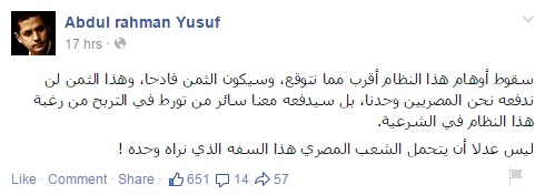 وكتب في تدوينة له عبر صفحته الرسمية على موقع"فيس بوك":" سقوط أوهام هذا النظام أقرب مما نتوقع، وسيكون الثمن فادحا، وهذا الثمن لن ندفعه نحن المصريين وحدنا، بل سيدفعه معنا سائر من تورط في التربح من رغبة هذا النظام في الشرعية".