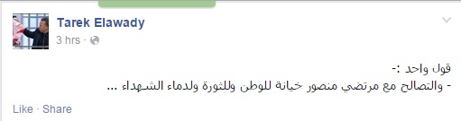 وكتب خلال تدوينة له عبر صفحته على موقع "فيس بوك": "قولا واحدا، التصالح مع مرتضى منصور خيانة للوطن وللثورة ولدماء الشهداء".