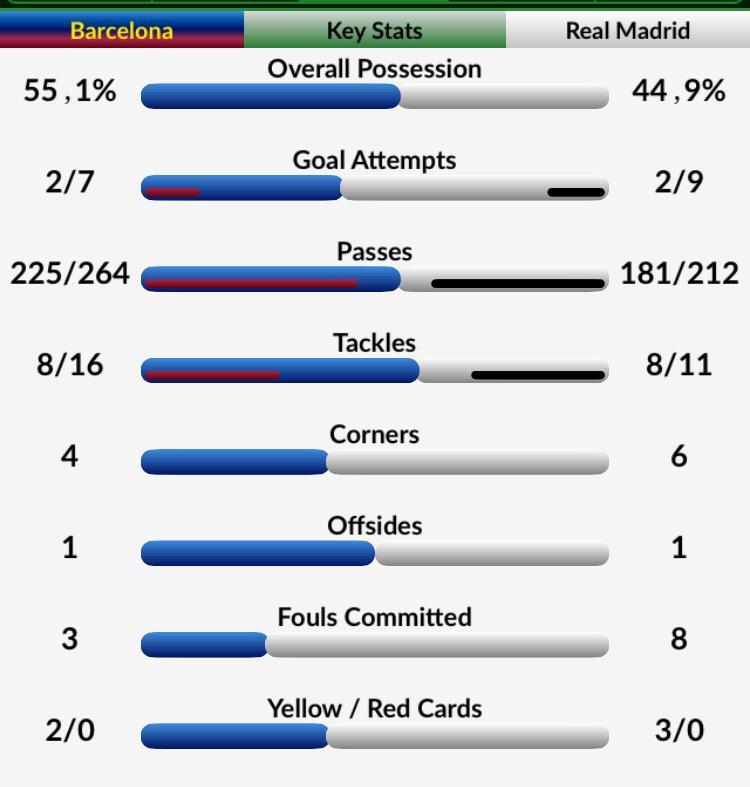 انتهى الشوط الأول من مباراة الكلاسيكو الشهير بين برشلونة وريال مدريد بالتعادل الإيجابي بنتيجة 1-1، في المباراة المقامة على أرض ملعب "كامب نو"، ضمن لقاءات الجولة 28 من الدوري الإسباني.