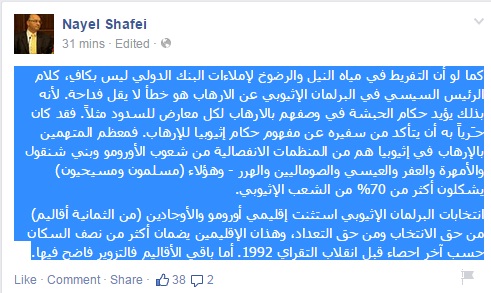 وكتب في تدوينة له عبر صفحته الرسمية على موقع"فيس بوك": "كما لو أن التفريط في مياه النيل والرضوخ لإملاءات البنك الدولي ليس بكافٍ، كلام الرئيس السيسي في البرلمان الإثيوبي عن الارهاب هو خطأ لا يقل فداحة".