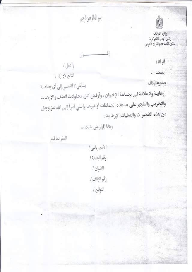 أصدرت مديرية الأوقاف في محافظة الفيوم إقرارا وزعته على إدارات المحافظة، لإلزام الإمام ومعتلي المنبر بالتوقيع على تبرئة من انتمائه لجامعة الإخوان المسلمين، كشرط أساسي لاعتلاء المنابر والخطابة في مساجد الفيوم.
