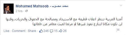 وعلق على مشهد القمة العربية اليوم من خلال تدوينة له عبر صفحته على موقع التواصل الاجتماعي "فيس بوك": "أمتنا العربية تنتظر إعلان قطيعة مع الاستبداد ومصالحة مع الحقوق والحريات، وقتها لن تكون مكانا لتنازع نفوذ غيرها أو مرتعا لعبث مغامر من طغاتها".