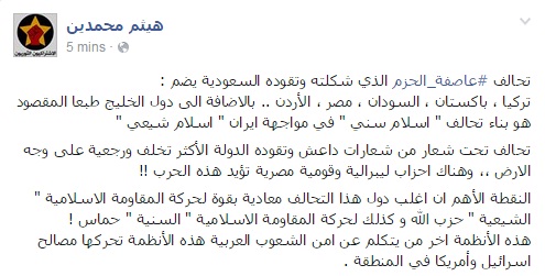 وكتب في تدوينة له عبر صفحته على موقع "فيس بوك": "تحالف #عاصفة_الحزم الذي شكلته وتقوده السعودية يضم: تركيا، باكستان، السودان، مصر، الأردن، بالإضافة إلى دول الخليج طبعا المقصود هو بناء تحالف "إسلام سني" في مواجهة إيران "إسلام شيعي".