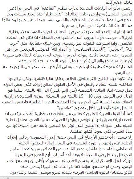 واختتم قائلًا: "كما سيكون الأمر على الأغلب في اليمن، ولكن تجار الحروب والسلاح في العالم، وفي المنطقة العربية، يتعامون عن هذه الحقائق البديهية لأن مصالحهم وثرواتهم هي ما يحركهم، والحروب هي مصدر ثراؤهم".