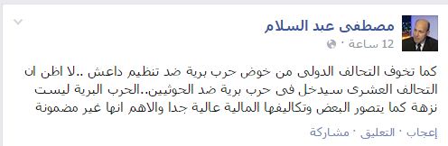 أكد الخبير الاقتصادي مصطفى عبد السلام، أنه كما تخوف التحالف الدولي من خوض حرب برية ضد تنظيم داعش، فان التحالف العشري قد يخشى الدخول في حرب برية ضد الحوثيين.