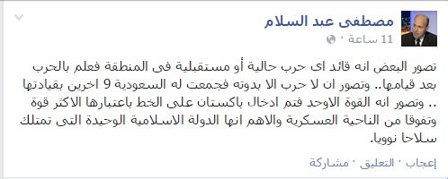 وتابع "وتصور أنه القوة الأوحد فتم ادخال باكستان على الخط باعتبارها الأكثر قوة وتفوقا من الناحية العسكرية، والأهم أنها الدولة الاسلامية الوحيدة التي تمتلك سلاحا نوويا".