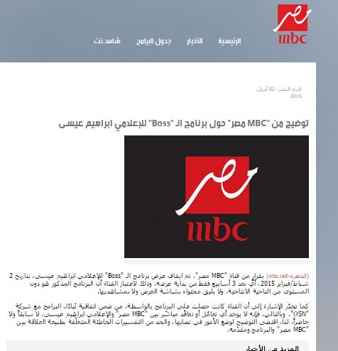 وقالت القناة، في بيان عبر موقعها الرسمي: "بقرارٍ من قناة "MBC مصر" تم إيقاف عرض برنامج الـ"Boss" للإعلامي إبراهيم عيسى، بتاريخ 2 فبراير 2015، أي بعد 3 أسابيع فقط من بداية عرضه، وذلك لاعتبار القناة أن البرنامج المذكور هو دون المستوى من الناحية الإنتاجية، ولا يليق محتواه بشاشة العرض ولا بمشاهديها".