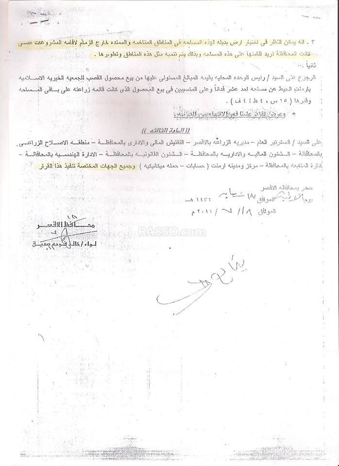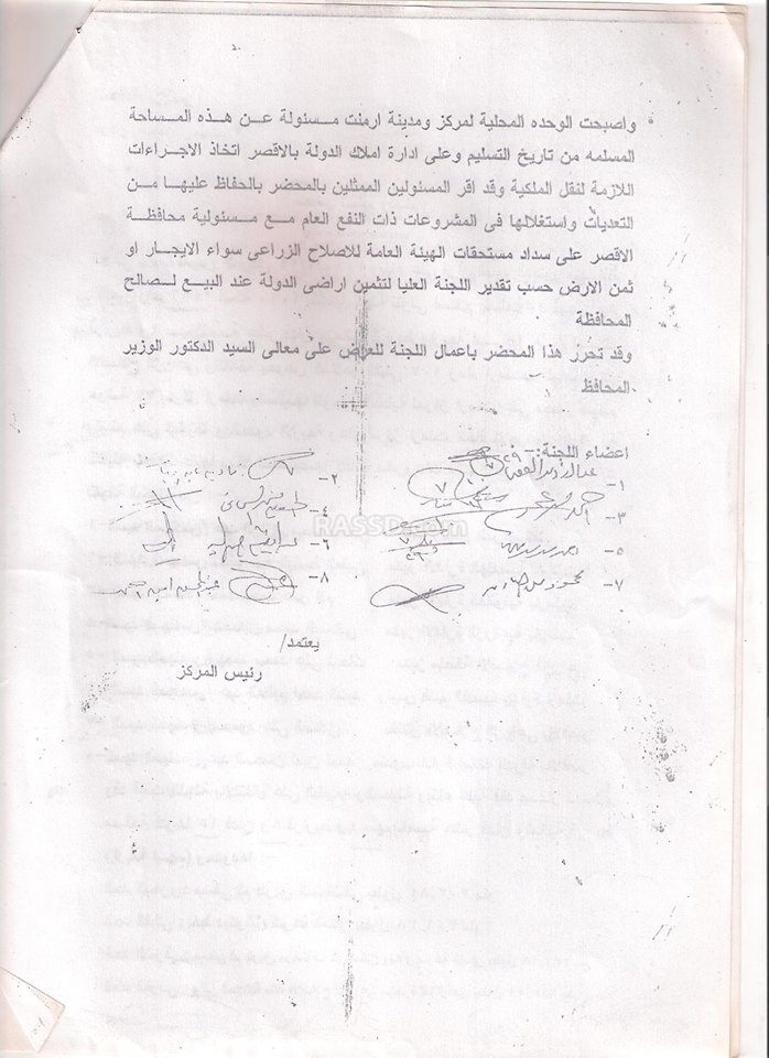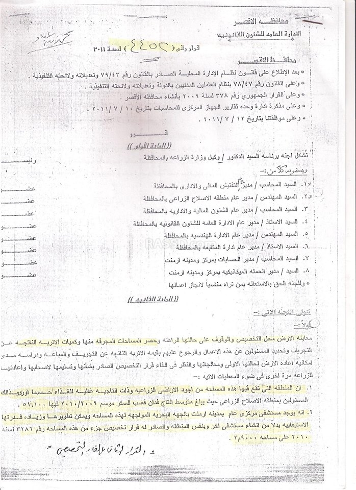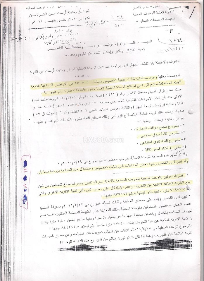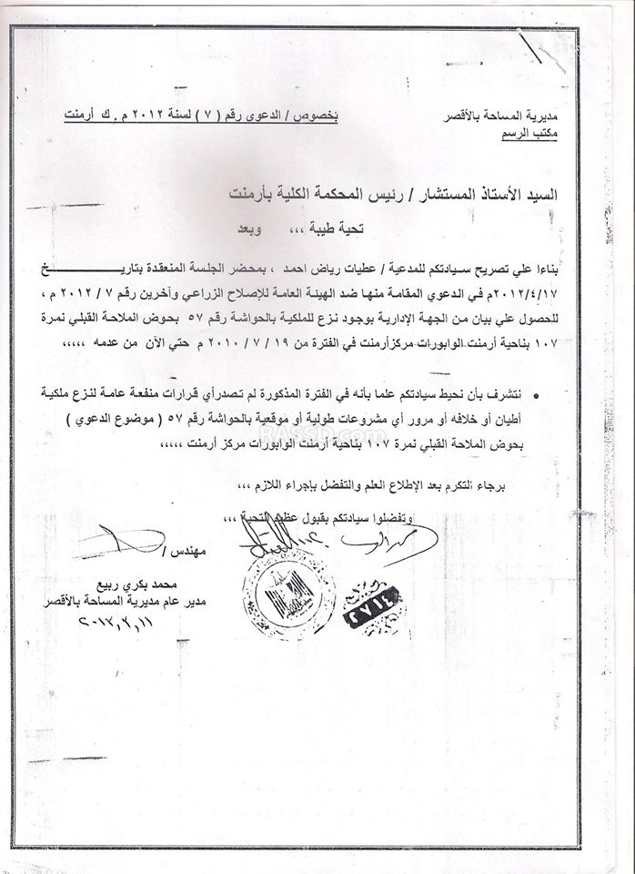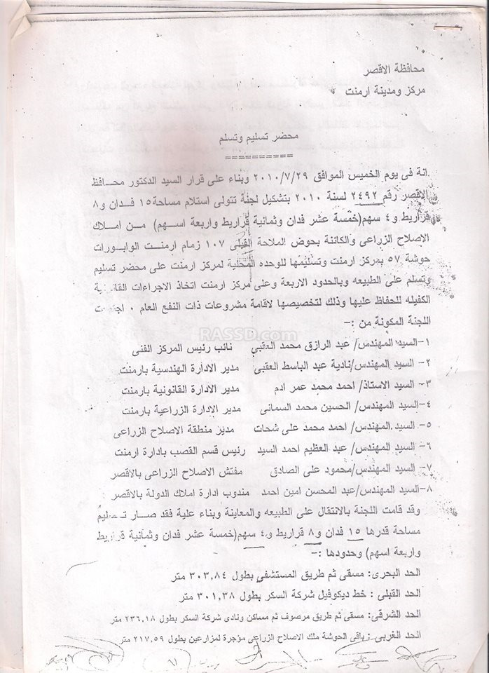 محضر مديرية المساحة بالأقصر الخاص بتسليم الأرض: