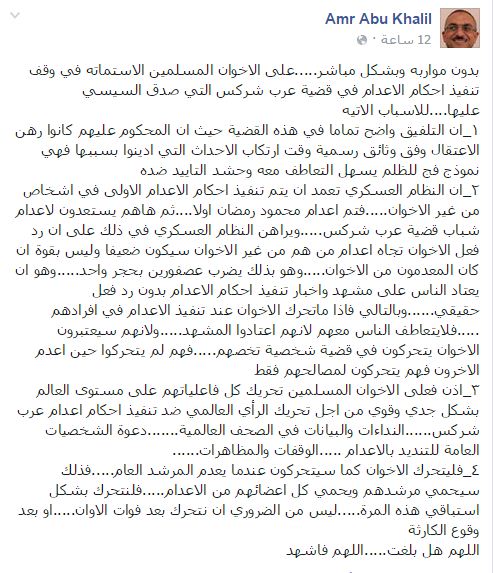 وفي تدوينة له على موقع التواصل الاجتماعي "فيس بوك"، سرد "أبوخليل" أربعة أسباب لضرورة أن يعمل الإخوان على وقف تنفيذ الحكم في القضية. السبب الأول: "أن التلفيق واضح تمامًا في هذه القضية".