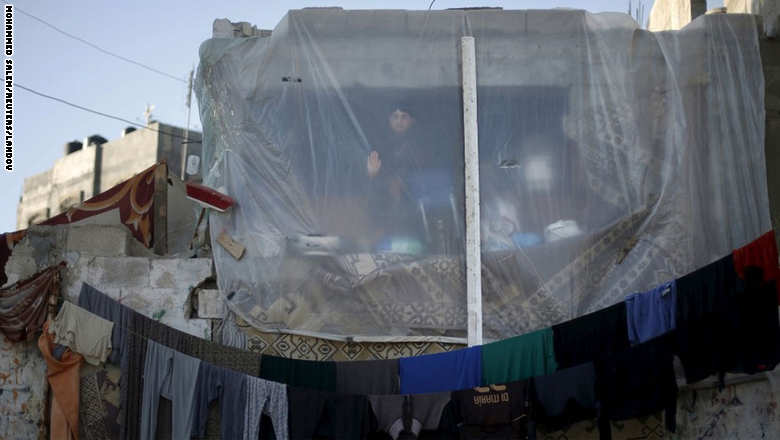 6. صبي فلسطيني ينظر عبر غلاف بلاستيكي يغطي جزءا من منزله في بيت حانون بغزة بعد تعرض المنزل لأضرار خلال العدوان الإسرائيلي الأخير على القطاع.