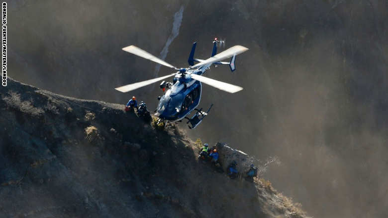 4. مروحية توصل عمال الإنقاذ لموقع قريب من المكان الذي تحطمت فيه الطائرة الألمانية التابعة لخطوط "جيرمان وبنجز".