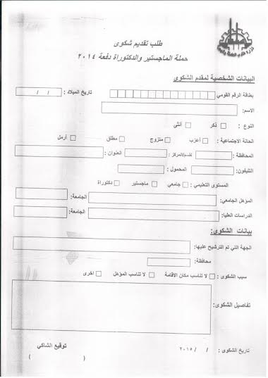 قالت ناهد عشري وزيرة القوى العاملة والهجرة بحكومة إبراهيم محلب أنه تقررفتح باب قبول شكاوي الحاصلين على الماجستير والدكتوراه عام 2014، من اليوم الاثنين، وحتى الأحد المقبل 12 إبريل 2015، من خلال استمارة تم توفيرها مجانا علي الموقع الالكتروني للوزارة على الرابط www.manpower.gov.eg.