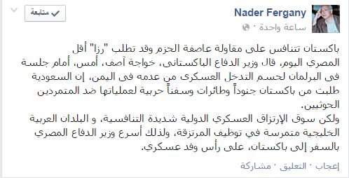 علق نادر فرجاني، أستاذ العلوم السياسية، على طلب السعودية من باكستان جنودًا وطائرات وسفنًا حربية للمشاركة في عاصفة الحزم، في اليمن، بقوله إن "باكستان تتنافس على مقاولة عاصفة الحزم وقد تطلب ’رزًا’ أقل".