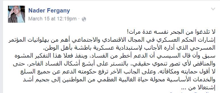 أما نادر فرجاني فقال في أكتوبر 2014، إن حكومة الانقلاب تمارس الخداع وتغرق الشعب في فشلها في ظل غياب رقابة شعبية مؤسسية، مشيراً إلى أن ذلك يرجع إلى غياب مجلس نيابي يباشر مهامه الدستورية في التشريع والرقابة على السلطة التنفيذية.