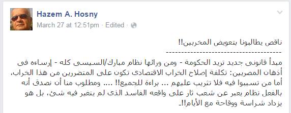 واختتم كلامه قائلاً: “مصر تواجه محنة بالتأكيد، وهى ستعبرها بإذن الله، وفى كل الأحوال لن يكون هذا بانصياعنا لنزوات السيد عبدالفتاح السيسى وصحبه، ولا هو سيكون بأن نتصارع مع الجيش الذي كان السيسى في يوم من الأيام قائده العام؛ فمصر بحاجة لكلينا بعيداً عن نزوات أصحاب النزوات، وما أكثرهم في الجانبين لا في صفوف الجيش وحده”.