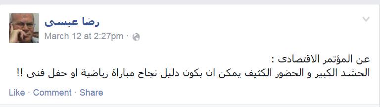 الباحث الاقتصادي رضا عيسي هاجم أيضا الحكومة وبخاصة تجاهلها للعمال فقال في سبتمبر 2014 أن الحكومة تتجه لدعم المستثمرين قائلا” أصحاب الأموال ليسوا بحاجة إلى دلع الحكومة”.