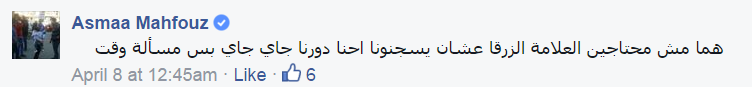 وأضافت “نجم”: “كل ما يُكتب عبر حسابكم سيكون إدانة حقيقية لكم، وأمنيًا الحسابات الموثقة بالعلامة الزرقاء يتم معاقبة أصحابها إذا كتبوا أي كلمة لا تعجب النظام”، بينما ردت الناشطة السياسية أسماء محفوظ تقول: “هما مش محتاجين العلامة الزرقاء عشان يسجنونا إحنا دورنا جاي جاي بس مسألة وقت”.