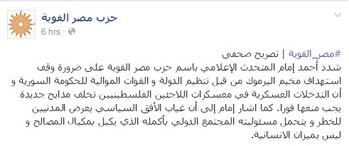 وحمل متحدث حزب مصر القوية، المجتمع الدولي مسؤولية ما يحدث في مخيم اليرموك، معتبرًا أنه يكيل بمكيال المصالح وليس بميزان الإنسانية، على حد قوله.