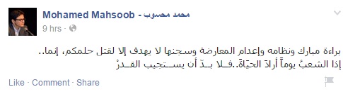 وقال محسوب، في تدوينة له عبر صفحته الرسمية على موقع “فيس بوك”: “براءة مبارك ونظامه وإعدام المعارضة وسجنها لا يهدف إلا لقتل حلمكم”، وأضاف: “إذا الشعبُ يوماً أرادَ الحيَاةَ.. فلا بد أن يستجيب القدر”.