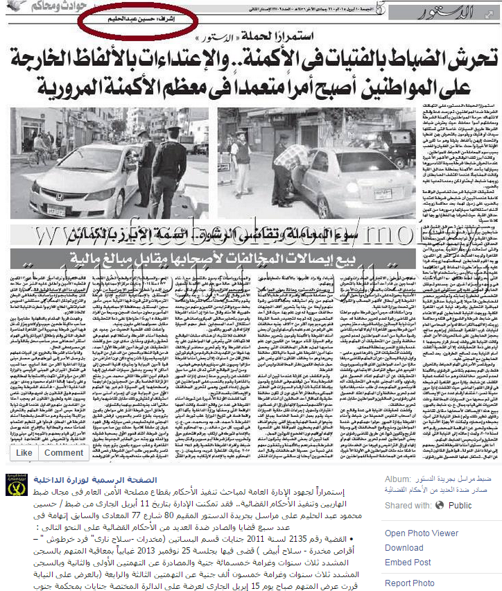 وتبنى الصحفي، حملة عبر صفحات الجريدة منذ يوم 5 أبريل الجاري، هاجم فيها أمناء الشرطة ورجال الداخلية تحت عناوين مثل “تحرش الضباط بالفتيات في الأكمنة.. والاعتداء بالألفاظ الخارجة على المواطنين أصبح أمرا متعمدا في معظم الأكمنة المرورية”، و”بالوقائع حبس عشرات الضباط خلال الأسابيع الماضية”.