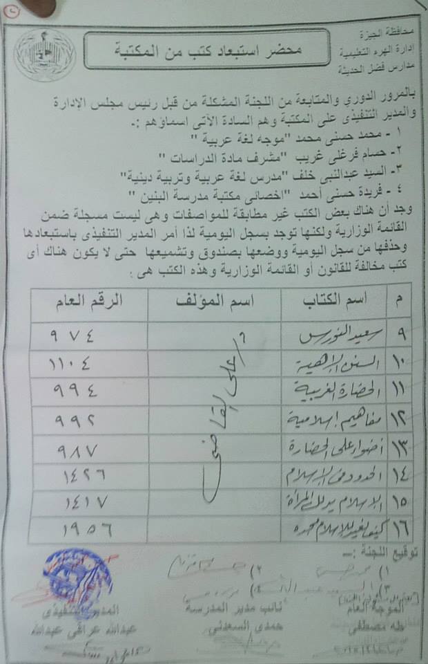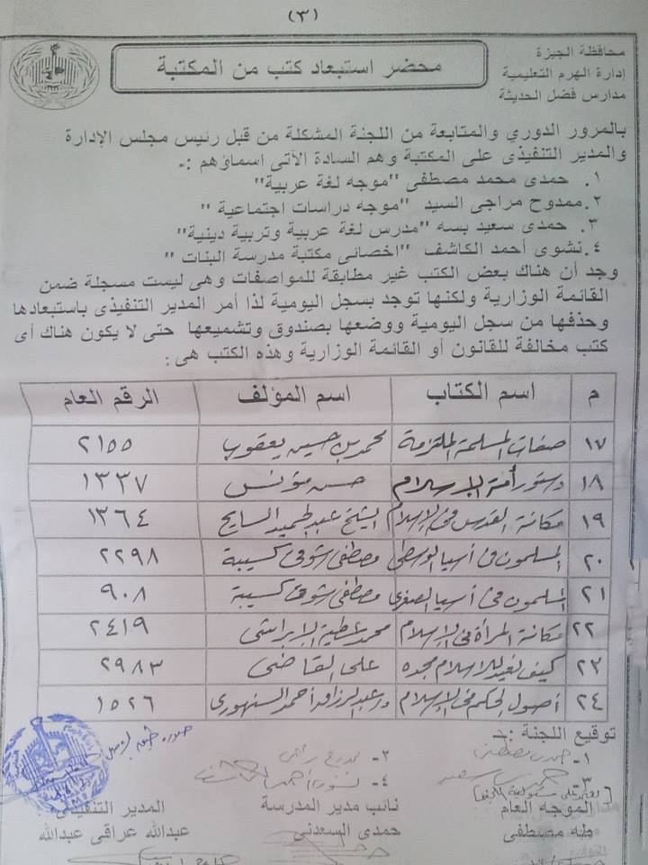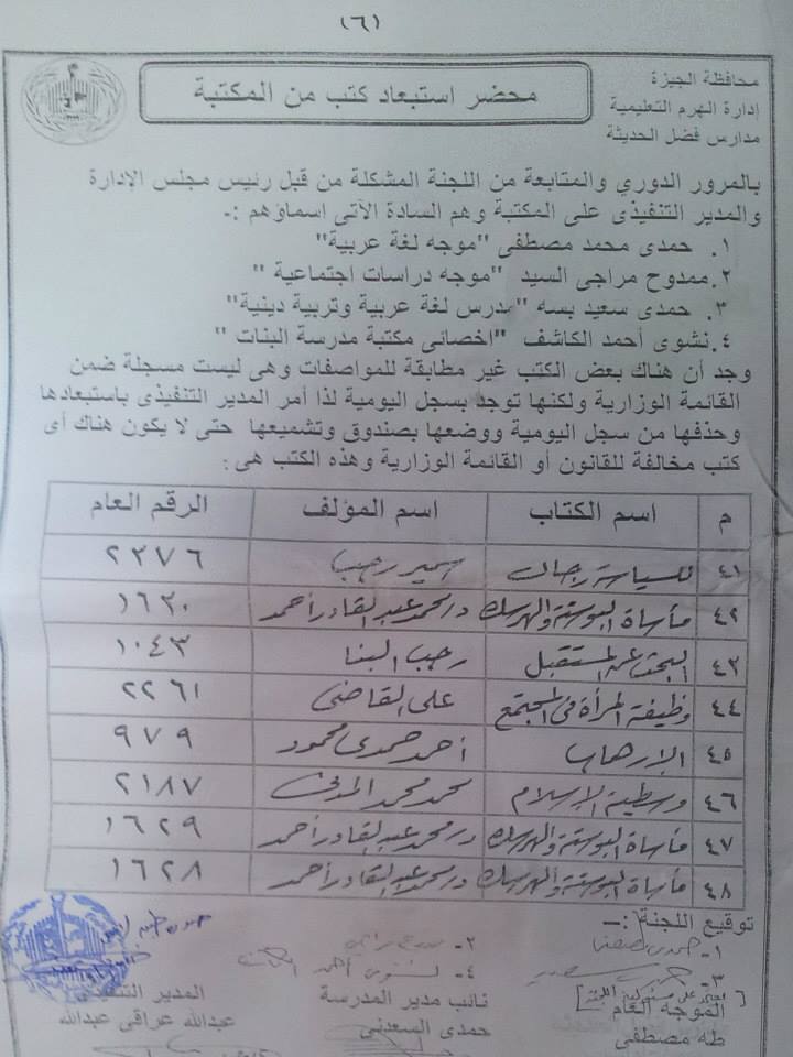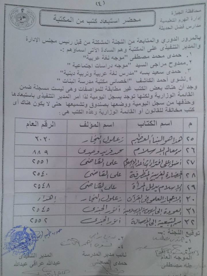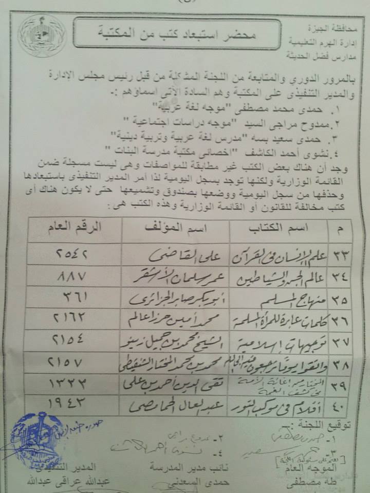 ونشرت مدرسة «فضل» قائمة بأسماء 75 كتابًا استبعدتهم مديرية التربية والتعليم بالجيزة من مكتبة مدرسة «فضل» الحديثة، باعتبار «تُخالف المواصفات الوزارية ومتواجدة بالمكتبة»، وهي: «الإسلام وأصول الحكم، مؤلفه على عبدالرازق، وأحداث النهاية مؤلفه محمد حسان، وعدو الإسلام مؤلفه جلال دويدار، وجمال الدين الأفغاني مؤلفه عثمان أمين، منهج الإصلاح الإسلامي مؤلفه شيخ الأزهر الأسبق عبدالحليم محمود، منهاج المسلم مؤلفه أبوبكر جابر الجزائري، هذه هو النبأ العظيم مؤلفه الدكتور زغلول النجار».