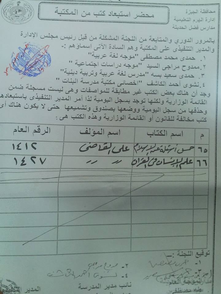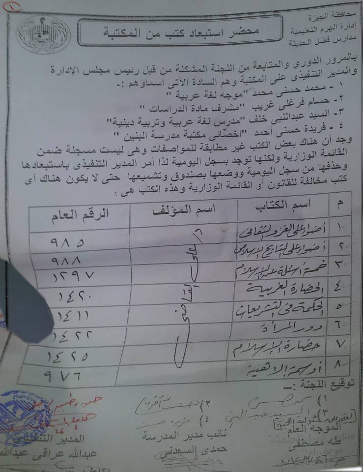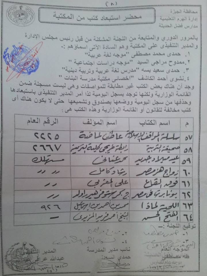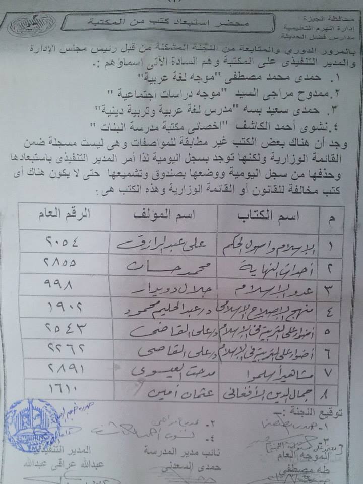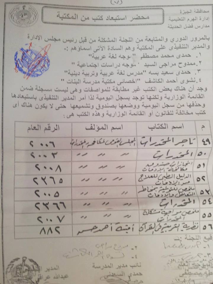 ونشرت مدرسة «فضل» قائمة بأسماء 75 كتابًا استبعدتهم مديرية التربية والتعليم بالجيزة من مكتبة مدرسة «فضل» الحديثة، باعتبار «تُخالف المواصفات الوزارية ومتواجدة بالمكتبة»، وهي: «الإسلام وأصول الحكم، مؤلفه على عبدالرازق، وأحداث النهاية مؤلفه محمد حسان، وعدو الإسلام مؤلفه جلال دويدار، وجمال الدين الأفغاني مؤلفه عثمان أمين، منهج الإصلاح الإسلامي مؤلفه شيخ الأزهر الأسبق عبدالحليم محمود، منهاج المسلم مؤلفه أبوبكر جابر الجزائري، هذه هو النبأ العظيم مؤلفه الدكتور زغلول النجار».