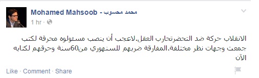 وقال محسوب، في تدوينة له عبر صفحته على موقع “فيس بوك”: “الانقلاب حركة ضد التحضر تحارب العقل، لا عجب أن ينصب مسؤولوه محرقة لكتب جمعت وجهات نظر مختلفة، المفارقة ضربهم للسنهوري من 60 سنة وحرقهم لكتابه الآن”.