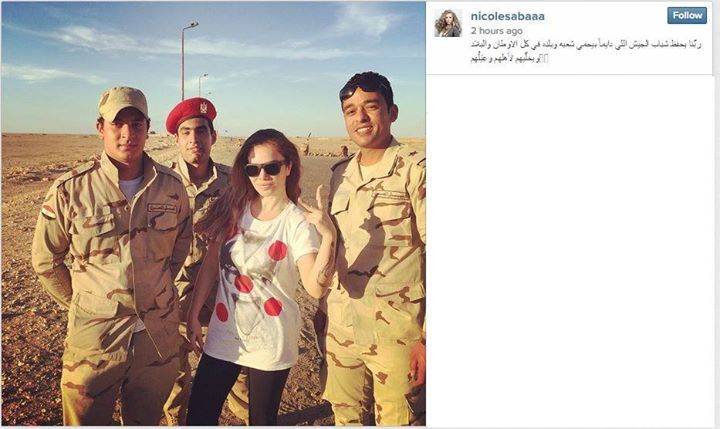 نشرت الفنانة اللبنانية نيكول سابا، صورة تذكارية لها مع ضباط وجنود من الجيش المصري، عبر حسابها الرسمي بموقع “انستجرام”، مما أثار ردود فعل ساخرة من المعلقين، حول اهتمام أفراد الجيش بالراقصات والممثلات، في ظل الأوضاع المشتعلة داخل البلا.
