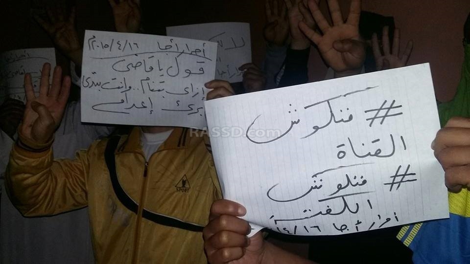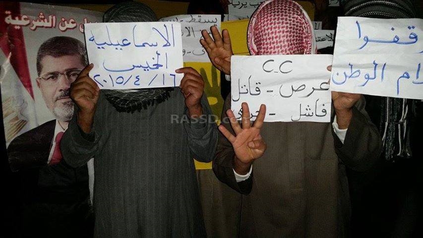 اختتم المعارضون للحكم العسكري في محافظة الإسماعيلية أسبوع “أوقفوا إعدام الوطن” بوقفة احتجاجية مساء اليوم، رفعوا خلالها شارات رابعة العدوية وصور الرئيس محمد مرسي، كما حملوا لافتات كتب عليها: “لا لإعدام الوطن”، و”سيسى قاتل فاشل حرامي”، و”لا لحملات الاعتقال”.