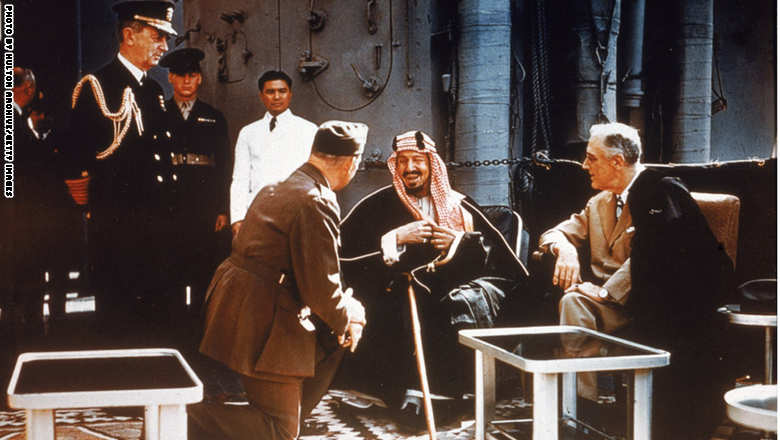 الملك السعودي عبدالعزيز آل سعود، مع الرئيس الأمريكي فرانكلين روزفلت، على متن سفينة حربة أمريكية، 20 فبراير 1945.