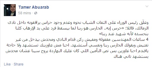 وكتب في تدوينة له عبر صفحته الرسمية على موقع “فيس بوك”: “وعلّق رئيس الوزراء على التفات الشباب نحوه وعدم وجود حراس يرافقونه داخل نادى الزمالك، قائلا: حرس إيه.. الحارس هو ربنا لما بيسقط فرد على يد الإرهاب كلنا بنحسده لأنه شهيد عند ربنا”.