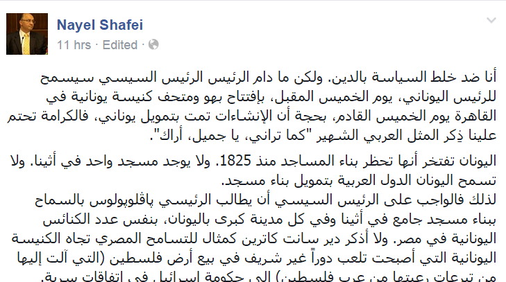 ودفعت زيارة الرئيس اليوناني، بنائل صلاح الشافعي، مؤسس موسوعة المعرفة، للتساؤل: “هل يطالب السيسي بابلوبولوس بالسماح ببناء مسجد جامع في أثينا، وفي كل مدينة كبرى باليونان، بنفس عدد الكنائس اليونانية في مصر؟”.