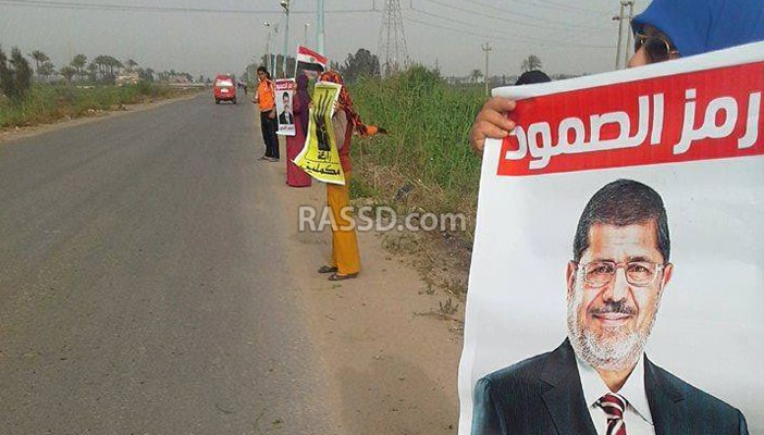 وعلى طريق دمياط – جمصة الزراعي، نُظمت سلسلة بشرية، رفعت فيها صور للرئيس محمد مرسي، ولافتات حملت شارات رابعة.