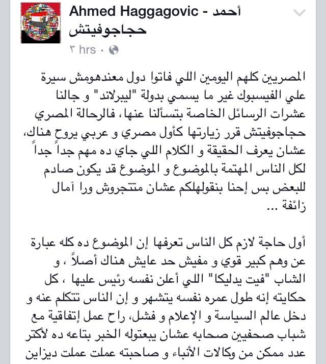 وأكد حجاجوفيتش أنه قام بزيارة “ليبرلاند” للتأكد بنفسه من صحة هذا الحديث بعد أن وردت إليه عبر صفحته عشرات الرسائل من المصريين للتأكد من حقيقة هذه الدولة.