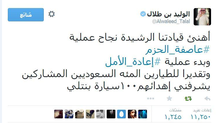 وقال الأمير الوليد بن طلال، عبر حسابه على “تويتر”: “أهنئ قيادتنا الرشيدة بنجاح عملية عاصفة الحزم، وبدء عملية إعادة الأمل، وتقديرًا للطيارين المئة السعوديين المشاركين يشرفني إهداؤهم 100 سيارة بنتلي”.
