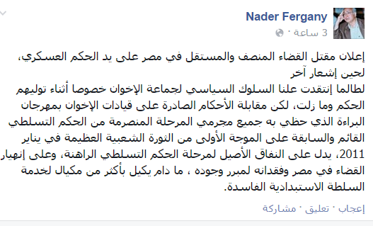 وصف المفكر الاجتماعي د. نادر فرجاني -أستاذ العلوم السياسية- الحكم الصادر على الرئيس محمد مرسي وآخرين بالسجن المشدد 20 عامًا، في القضية المعروفة إعلاميًا بـ”أحداث الاتحادية”، بأنه “إعلان مقتل القضاء المنصف والمستقل في مصر على يد الحكم العسكري، لحين إشعار آخر”.