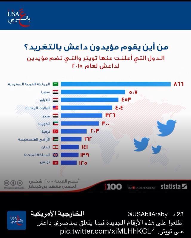 وكان من اللافت الحضور العربي الكثيف في قائمة الدول الأكثر تغريدًا لصالح تنظيم الدولة الإسلامية، إذ تواجدت على قائمة الدول التي تنطلق منها تغريدات مؤيدة للتنظيم، ثمانية دول عربية، من أصل 11 دولة شملهتها إحصاءات “تويتر”.