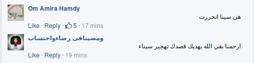 ومن جانبها تساءلت أميرة حمدي، “هي سينا اتحررت علشان نحتفل”، وأضافت كل يوم بيموت عساكر ومواطنين، والمتحدث العسكري يطلع يقول دمرت عشش ومخازن سلاح، وفي الآخر برضو الإرهاب لسه شغال”.