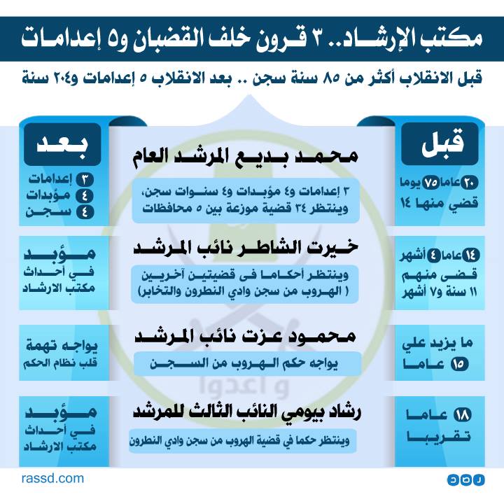 شهد آخر مكتب إرشاد لجماعة الإخوان المسلمين، قبل الانقلاب أكثر من 85 سنة سجنا لأعضائه مجتمعين، وبعد الانقلاب 5 إعدامات و204 سنة وينتظرون أحكاما في عشرات القضايا، وجاءت الأحكام بحق أفراد المكتب كالتالي: