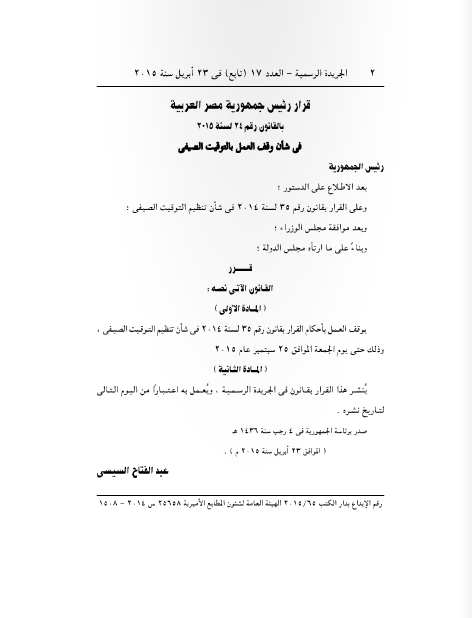 نشرت الجريدة الرسمية، فى عددها الصادر اليوم الأحد، قرار قائد الانقلاب العسكري عبدالفتاح السيسى، بوقف العمل بأحكام القرار بقانون رقم 35 لسنة 2014، بشأن تنظيم التوقيت الصيفي، خلال فصل الصيف القادم، وذلك حتى يوم الجمعة 25 سبتمبر 2015.