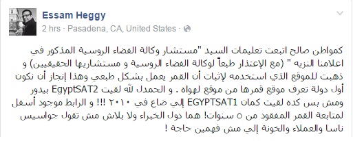 وأضاف قائلا:” والحمد لله لقيت EgyptSAT2 بيدور ومش بس كده لقيت كمان EGYPTSAT1 اللي ضاع في ٢٠١٠! و الرابط موجود أسفل لمتابعة القمر المفقود من ٥ سنوات! هما دول الخبراء ولا بلاش، مش تقول جواسيس ناسا والعملاء والخونة اللي مش فاهمين حاجة!”.