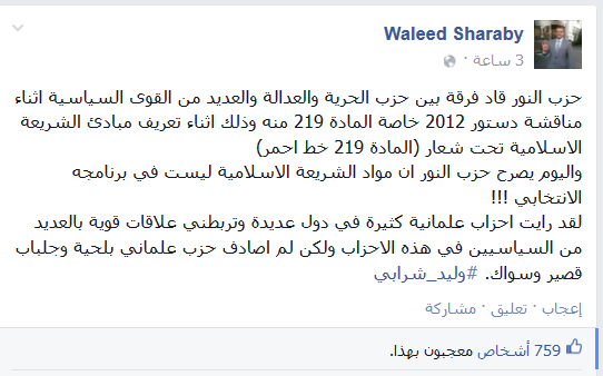 وقال عبر تدوينة له على موقع التواصل الاجتماعي “فيس بوك”- “حزب النور قاد فُرقة بين حزب الحرية والعدالة، والعديد من القوى السياسية أثناء مناقشة دستور 2012 خاصة المادة 219 منه، وذلك اثناء تعريف مبادئ الشريعة الاسلامية تحت شعار (المادة 219 خط أحمر).