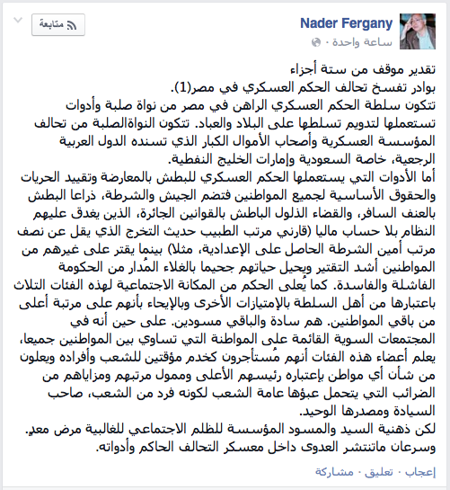 قال نادر فرجاني المفكر والاستاذ بجامعة القاهرة، إن سلطة الحكم العسكري الراهن في مصر تتكون من نواة صلبة وأدوات تستعملها لتدويم تسلطها على البلاد والعباد.
