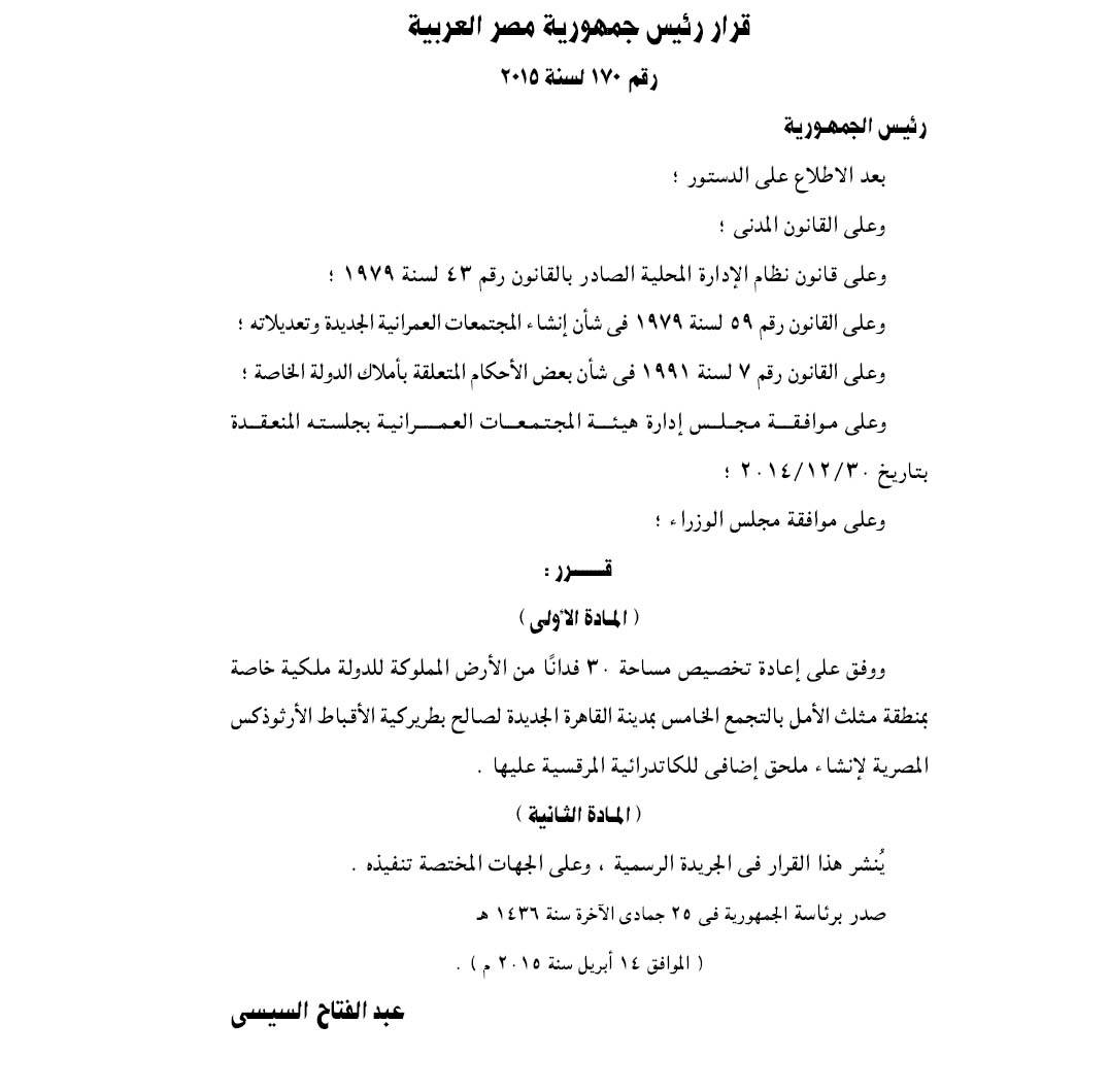أصدر قائد الانقلاب العسكري، عبدالفتاح السيسي، قرارًا جمهوريًا، رقم 170 لعام 2015، بإعادة تخصيص قطعة أرض مساحتها 30 فدانًا، من الأراضي المملوكة للدولة، لصالح بطريركية الأقباط الأرثوذوكس.