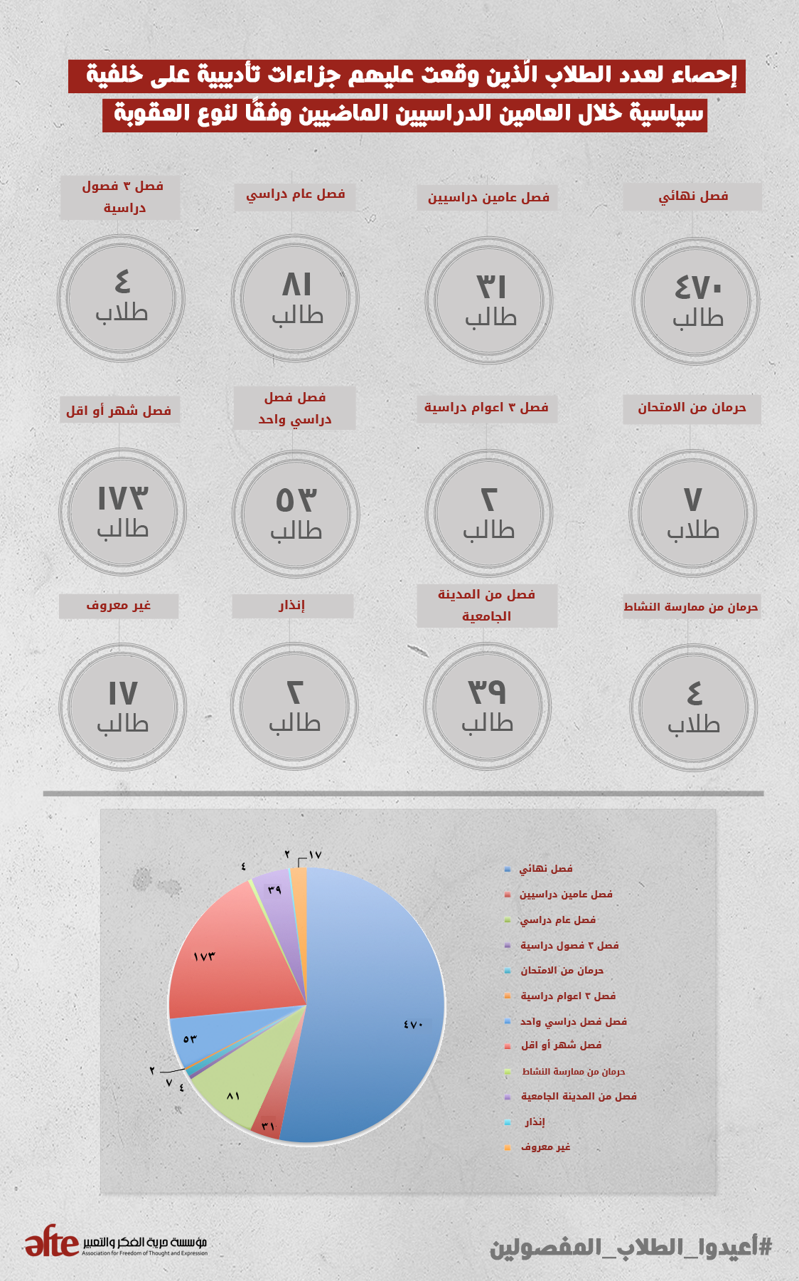 وأشارت “حرية التعبير”- عبر تقرير لها على  موقعها- إلى أن  حيث عدد الطلاب المفصولين نهائيًا خلال العامين الدراسيين، تخطى نصف ما شمله الحصر بواقع 470 طالبًا، بينما بلغ عدد الطلاب المفصولين لمدة شهر أو أقل 173 طالبًا. في الوقت الذي فصل فيه 81 طالبًا لمدة عام دراسي كامل. كما فصل 53 طالبًا فصل دراسي واحد و31 طالبًا لعامين دراسيين، وذلك في مختلف الجامعات.
