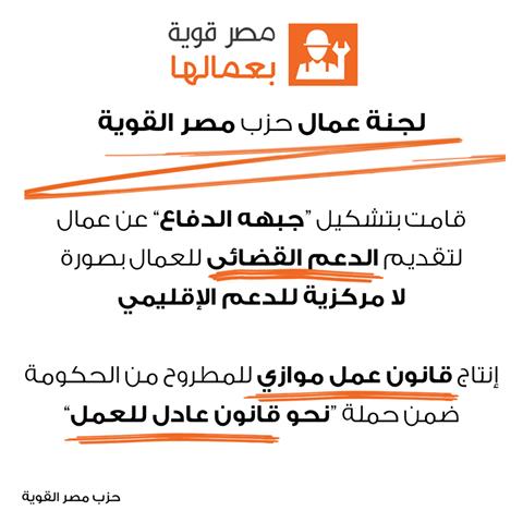 أعلن حزب مصر القوية عن تشكيل لجنة العمال في الحزب لجبهة دفاع عن العمال لتقديم الدعم القضائي بصورة لا مركزية للدعم الإقليمي